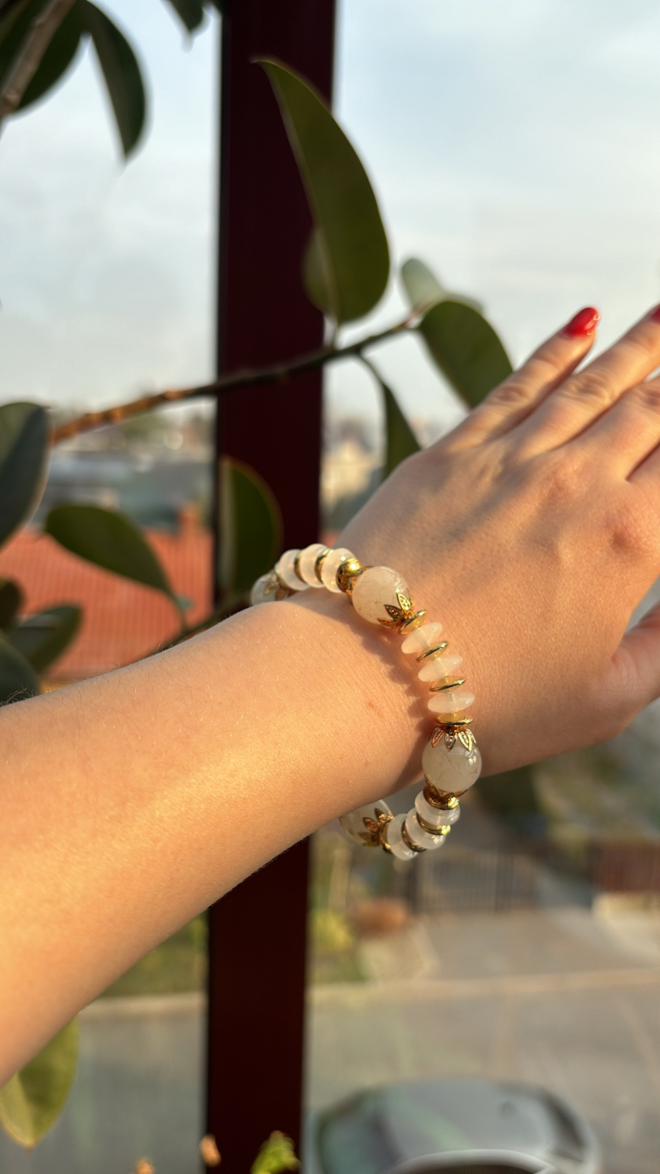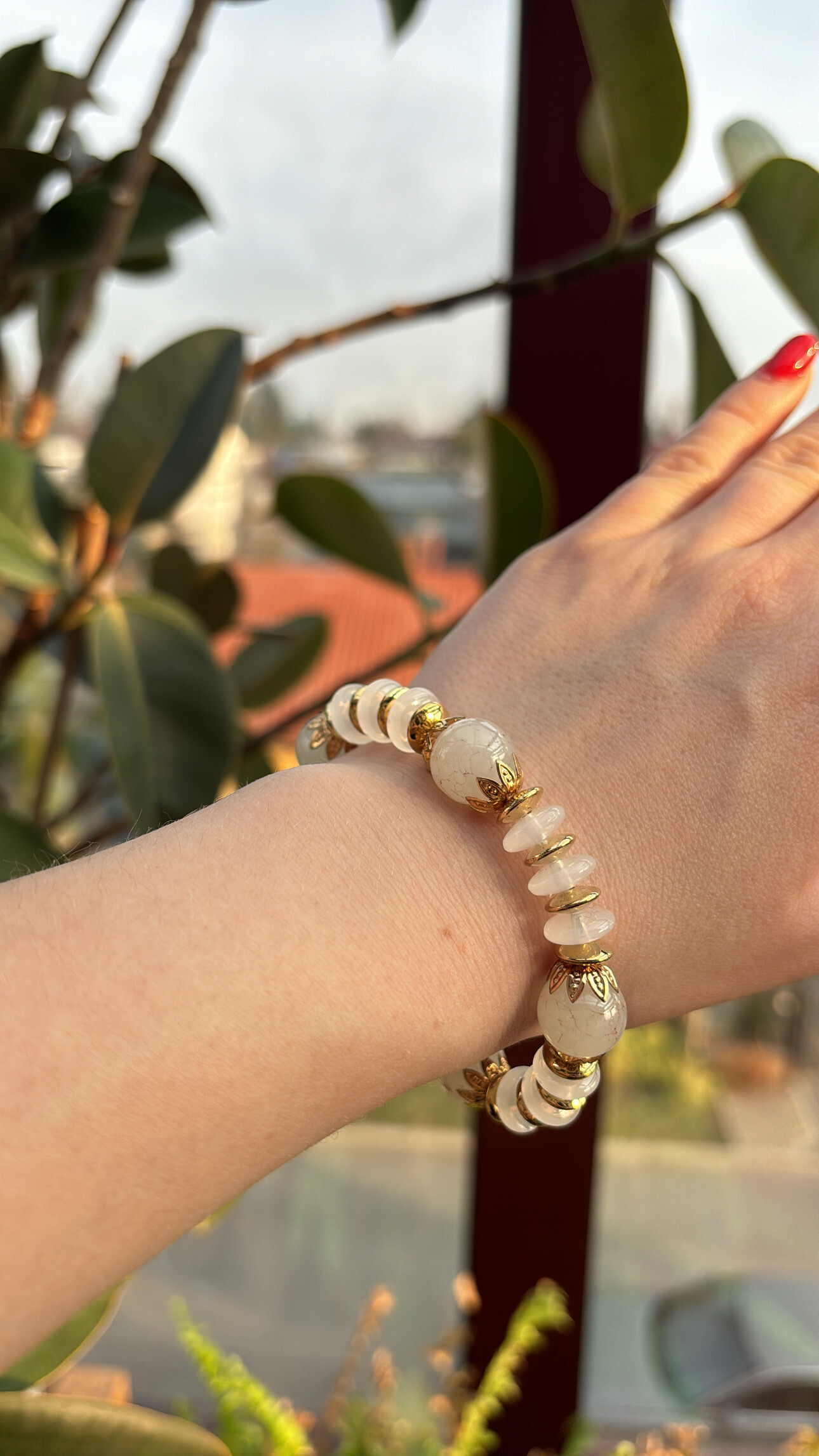 Bransoletka w stylu boho wykonana z szklanych i plastikowych koralików z złotymi akcentami.