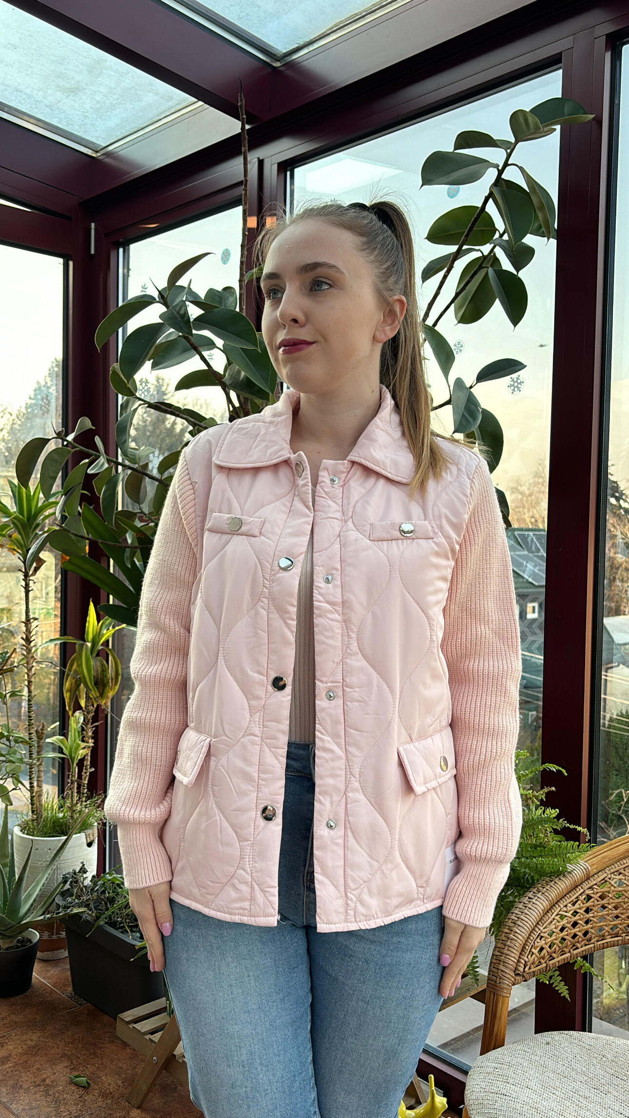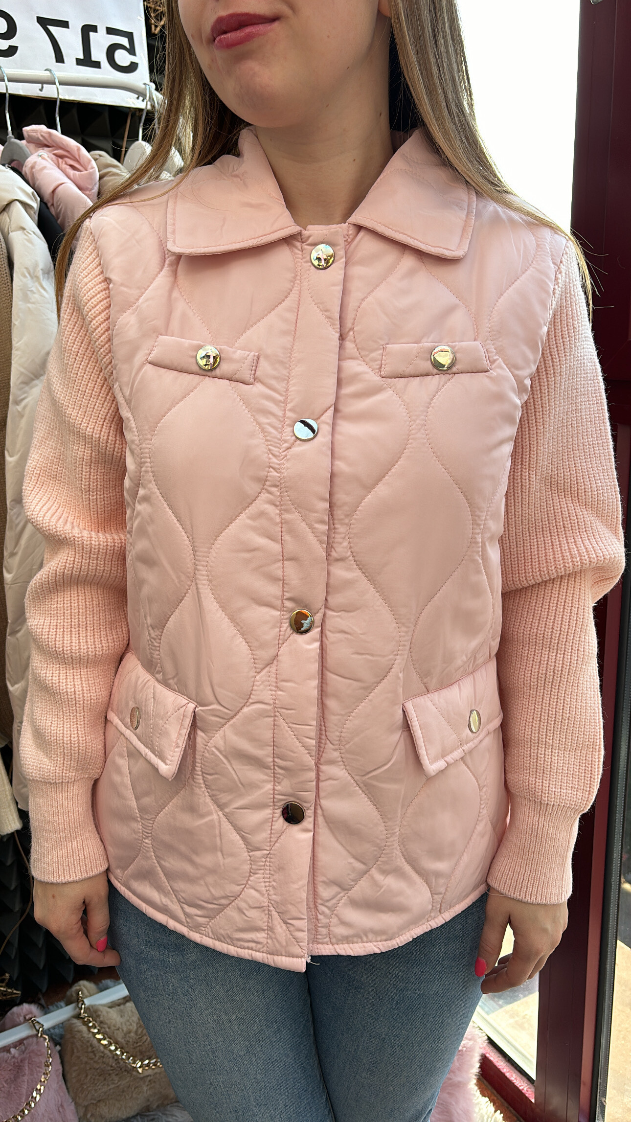 Pikowana kurtka ze sweterkowymi zwężanymi rękawami, ciepła i miła w dotyku. Zapięcie na napy. Z przodu posiada dwie kieszenie.