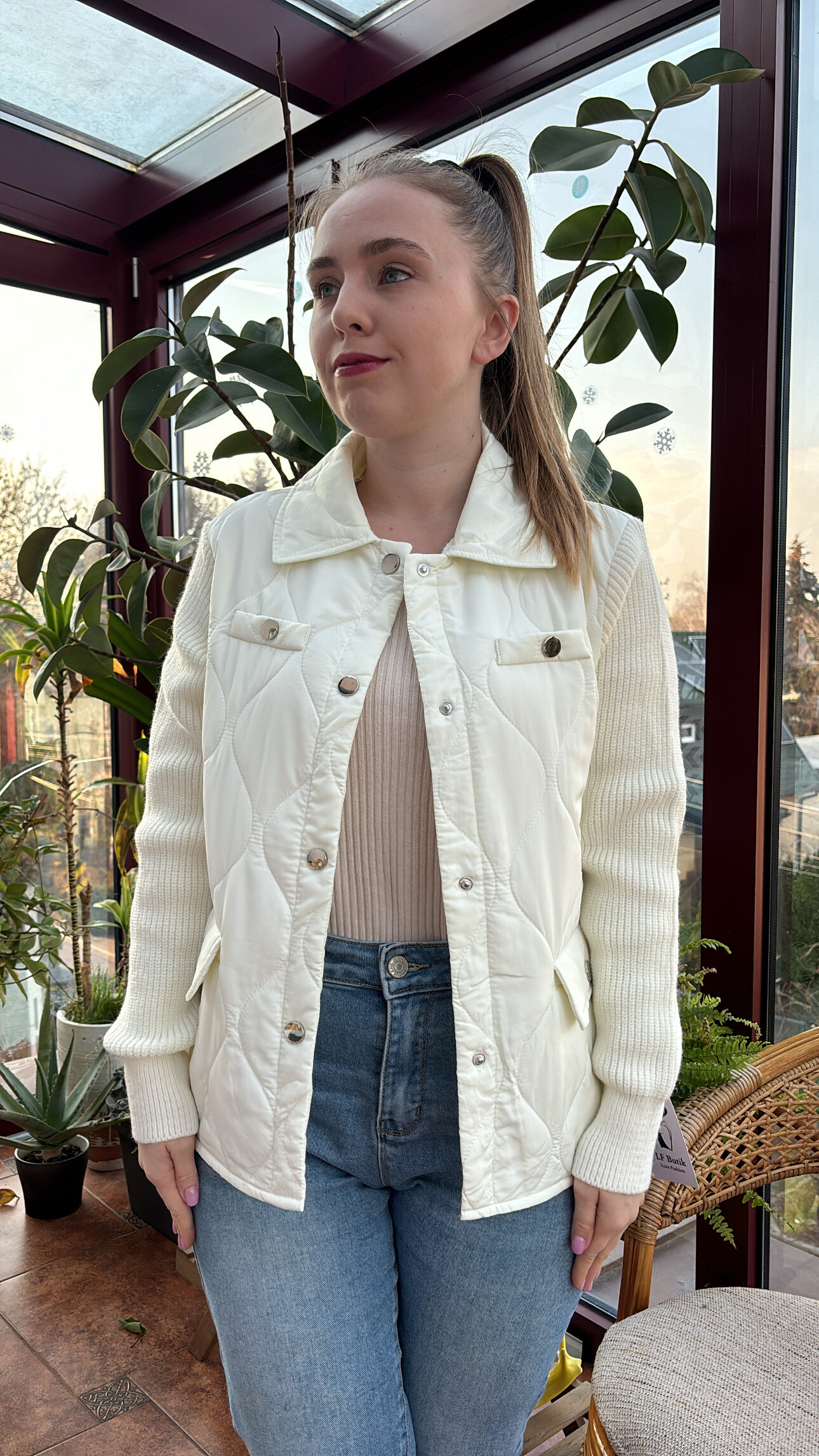Pikowana kurtka ze sweterkowymi zwężanymi rękawami, ciepła i miła w dotyku. Zapięcie na napy. Z przodu dwie kieszenie.