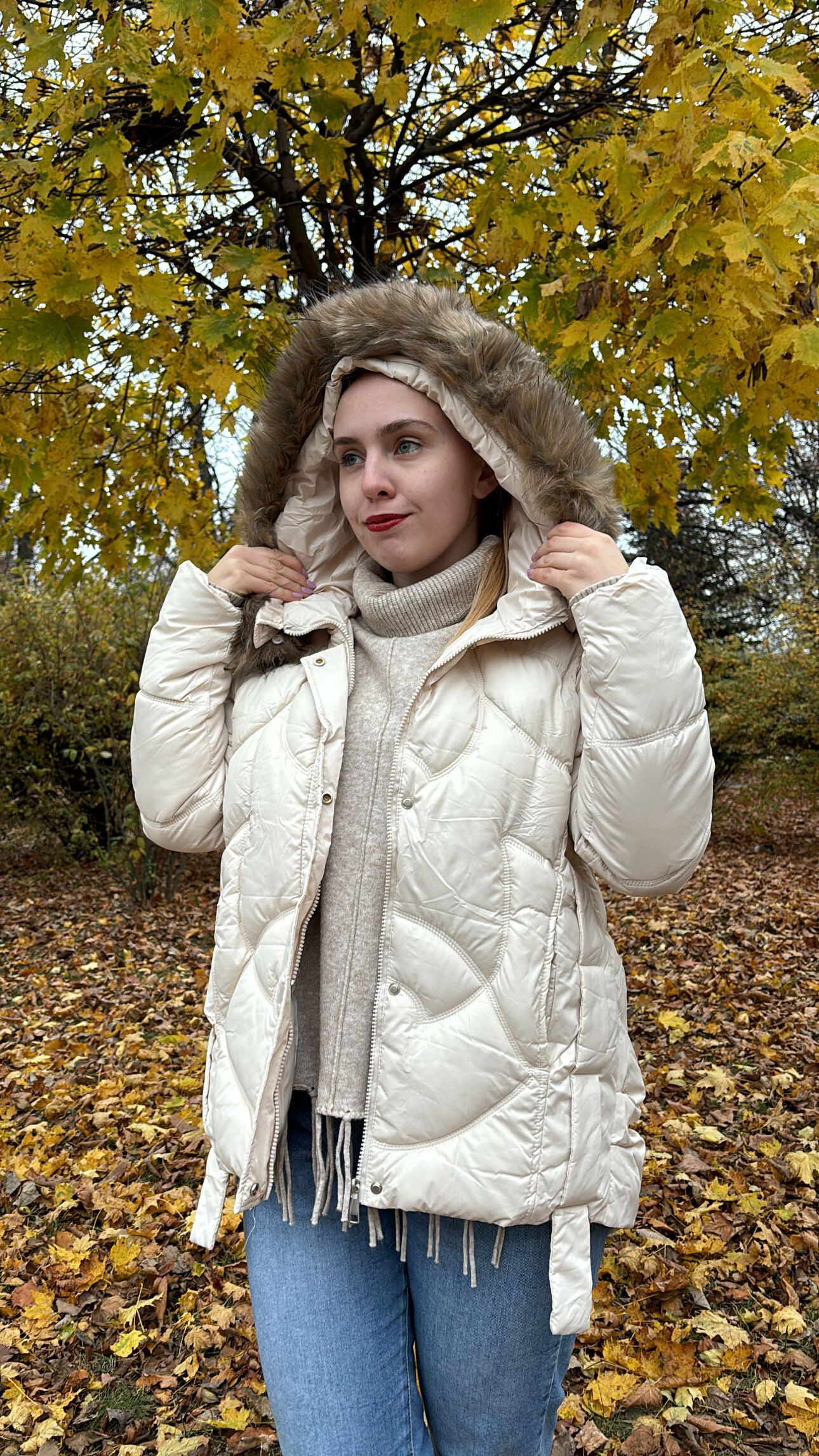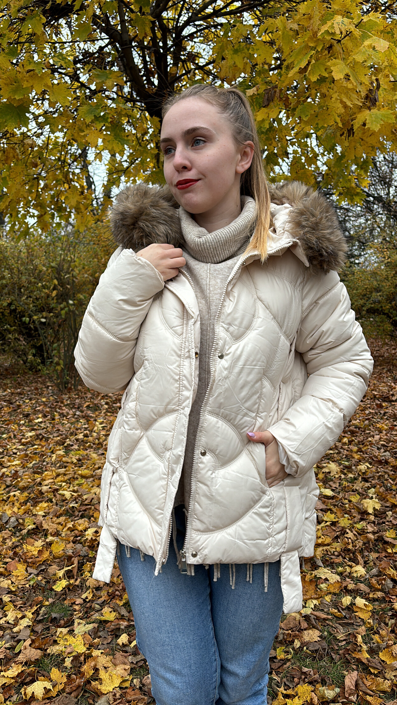 Przepiękna kurtka ocieplana puchem syntetycznym z kapturem oraz odpinanym futerkiem, posiadający użytkowe kieszenie.