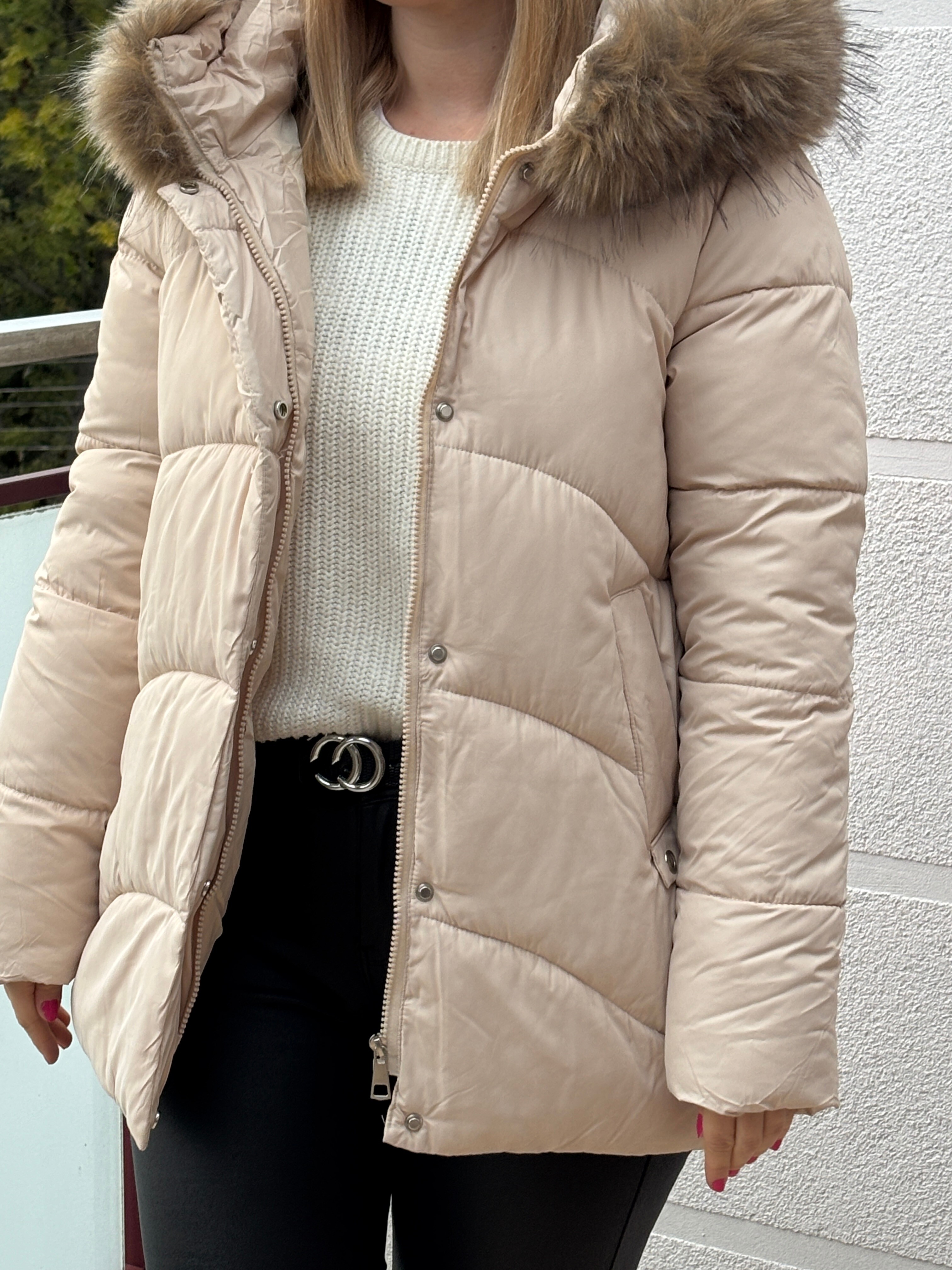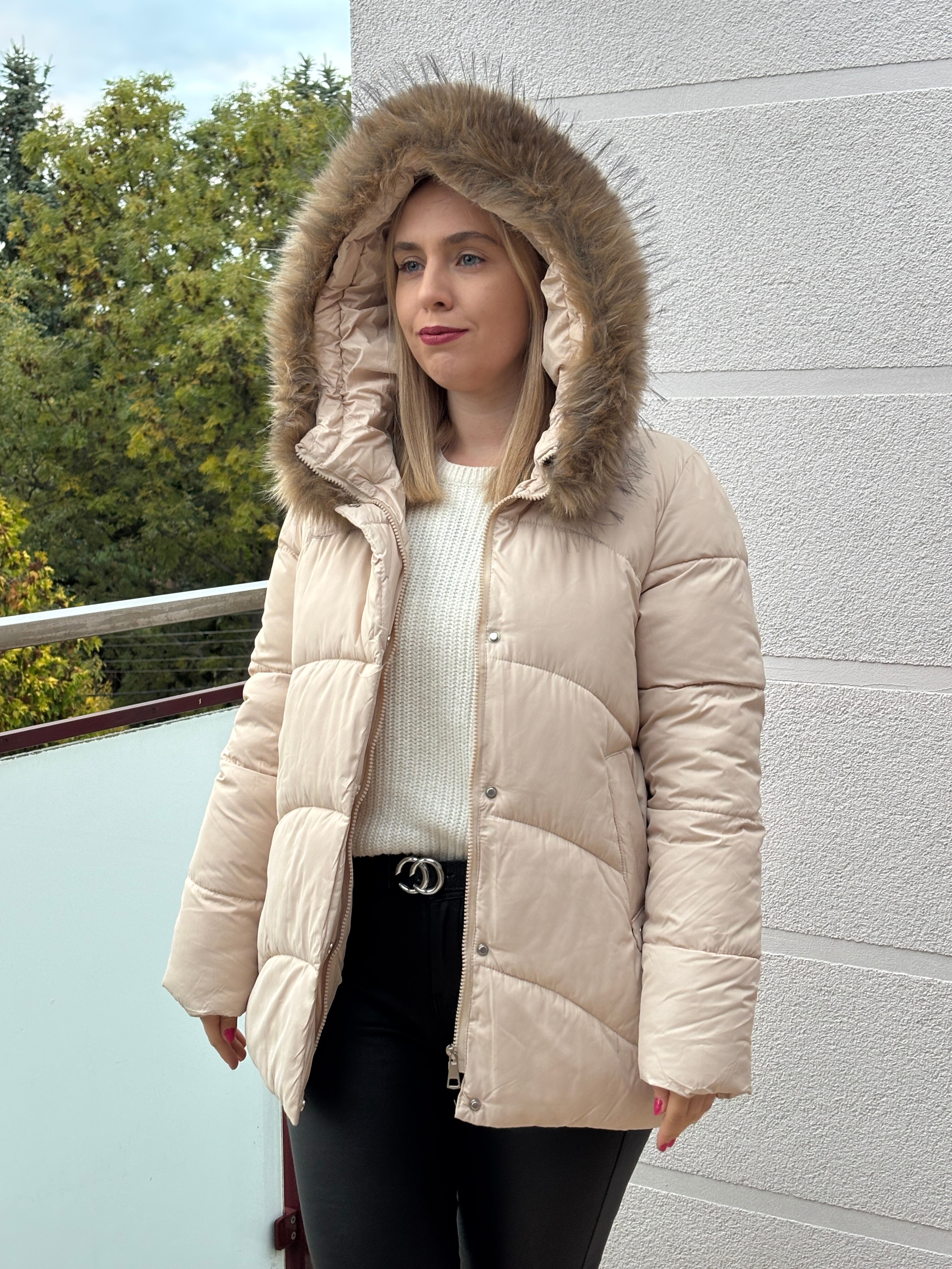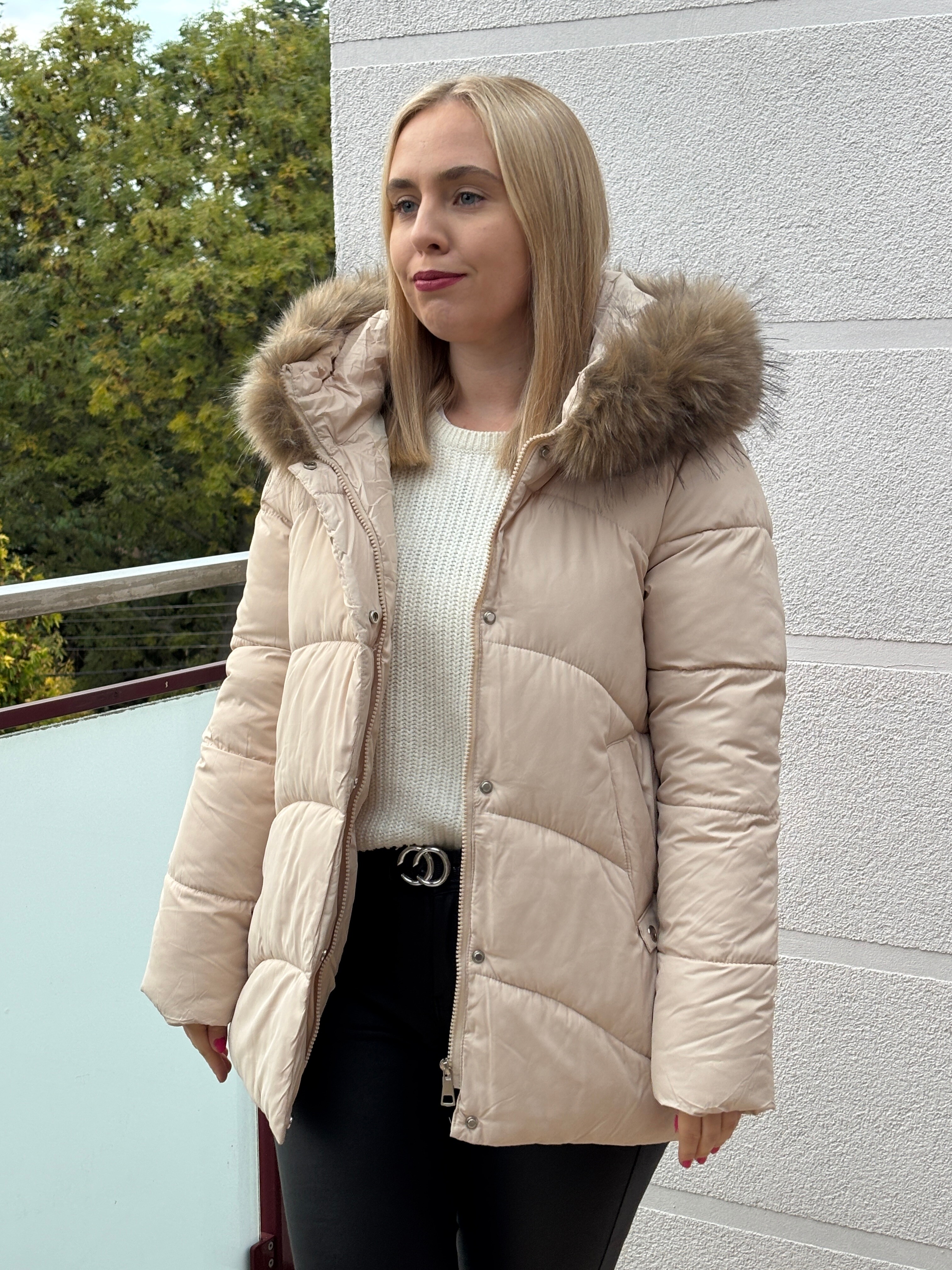 Przepiękna klasyczna kurtka ocieplana puchem syntetycznym z kapturem oraz odpinanym futerkiem, posiadający użytkowe kieszenie.