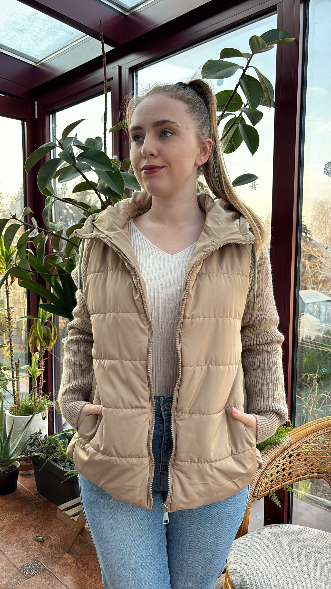Kurtka z poprzecznymi przeszyciami, sweterkowymi rękawami oraz z pojemnym kapturem ze ściągaczami. Posiada dwie kieszenie z przodu. Zapinana jest na suwak.