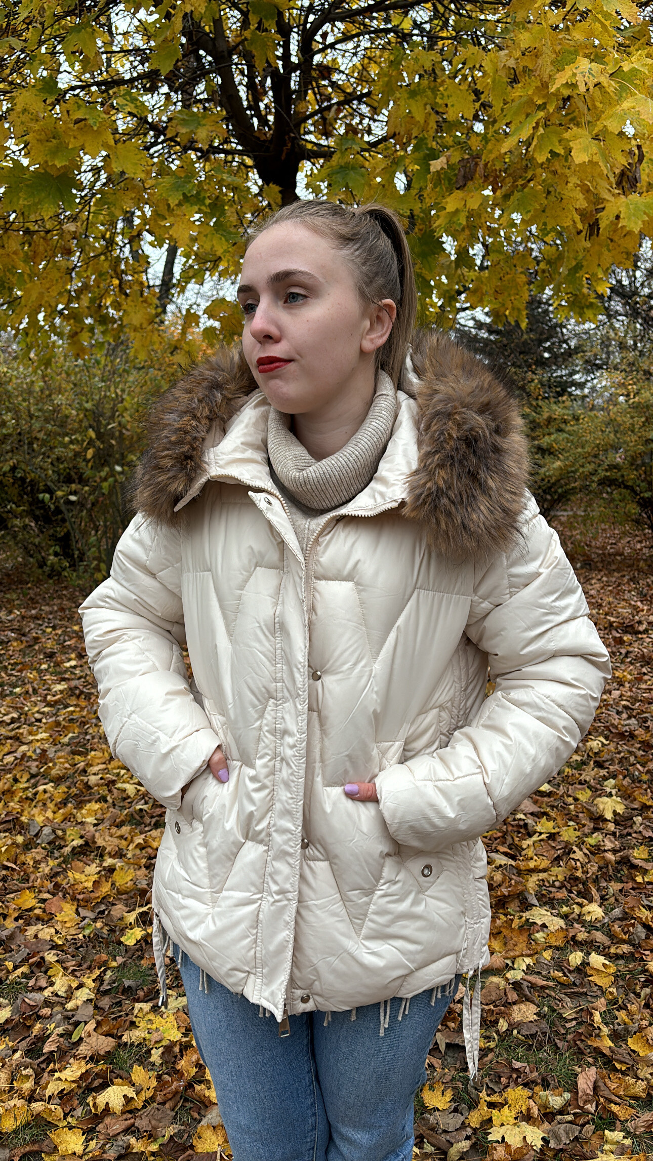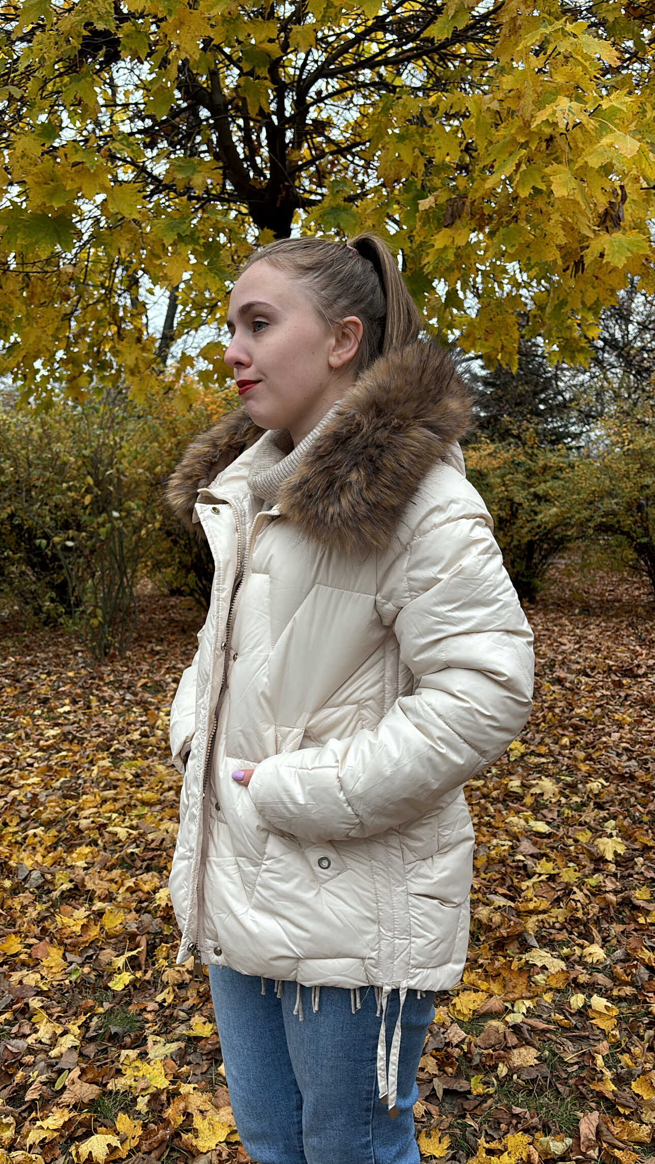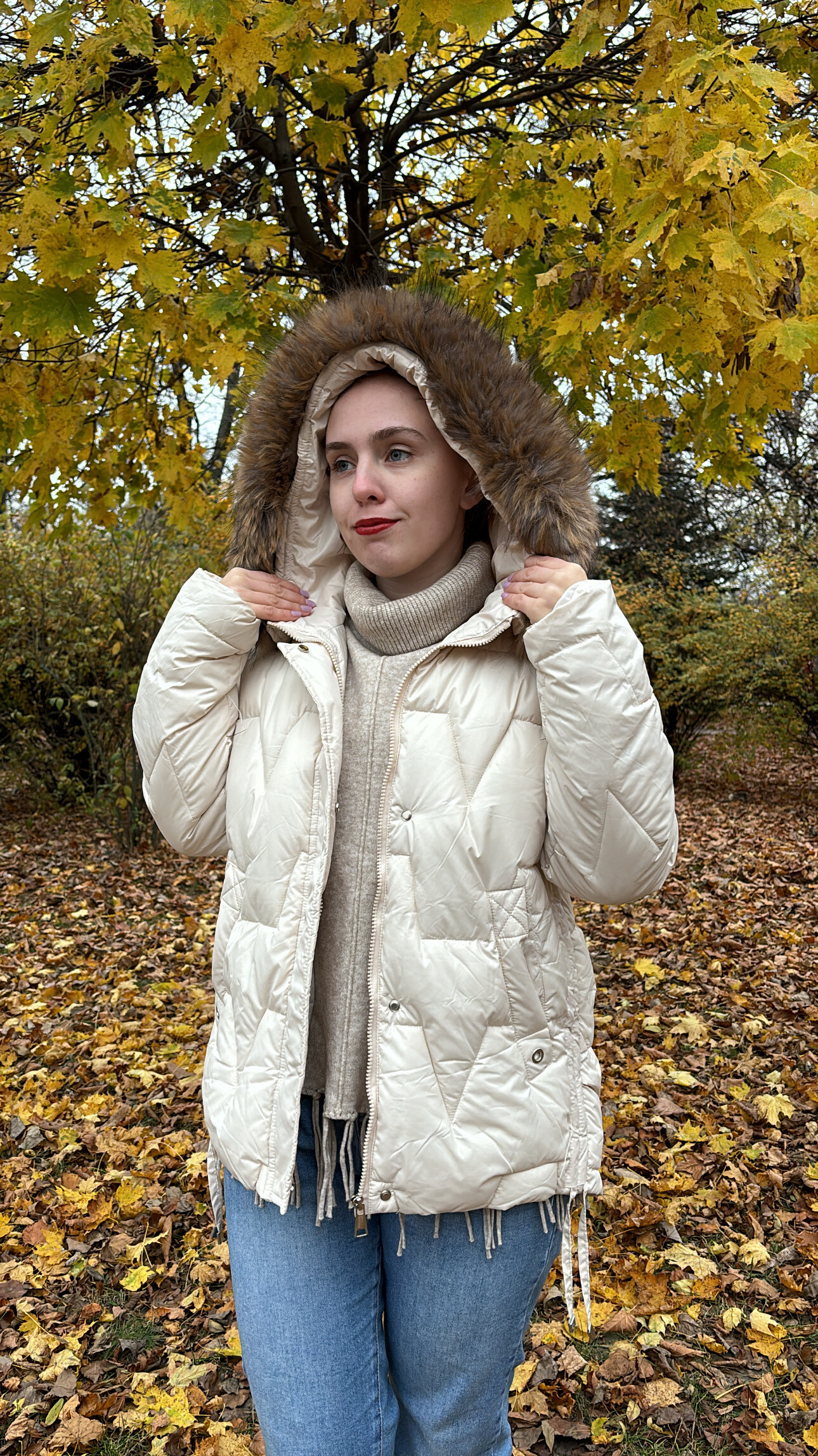 Stylowa i ciepła kurtka na chłodniejsze dni. Charakterystyczny pikowany wzór w kształcie litery V nadaje jej nowoczesnego wyglądu i optycznie wysmukla sylwetkę. Miękki futrzany kołnierz dodaje elegancji, a praktyczne kieszenie i zapięcie na suwak zapewniają wygodę. Kurtka posiada ściągacze po bokach, dzięki którym można dopasować ją idealnie do sylwetki. Doskonały wybór do miejskich i casualowych stylizacji.