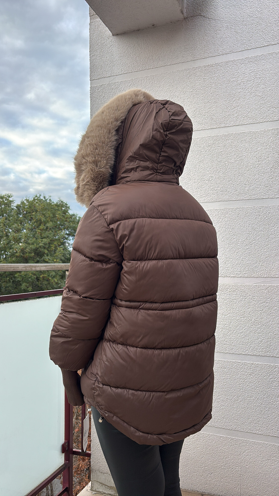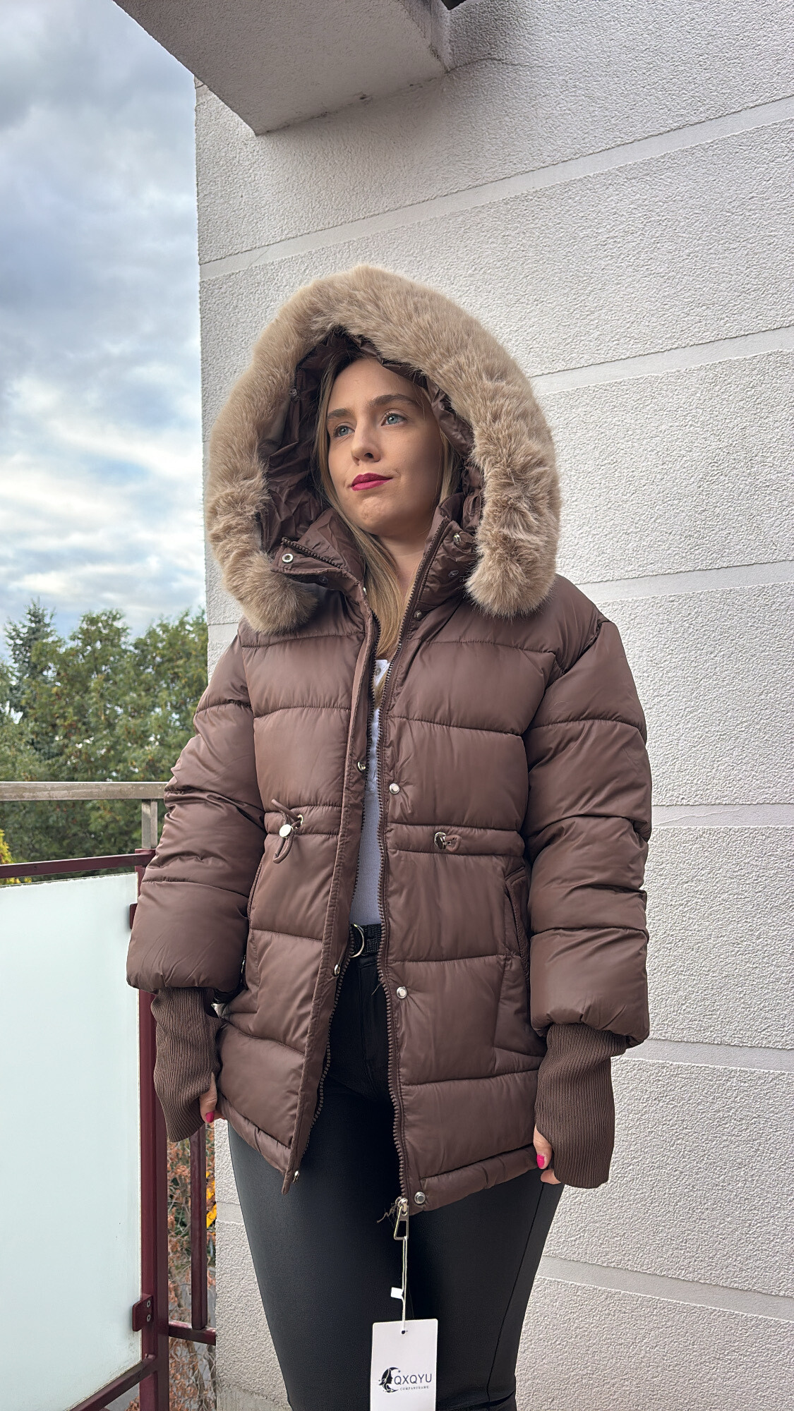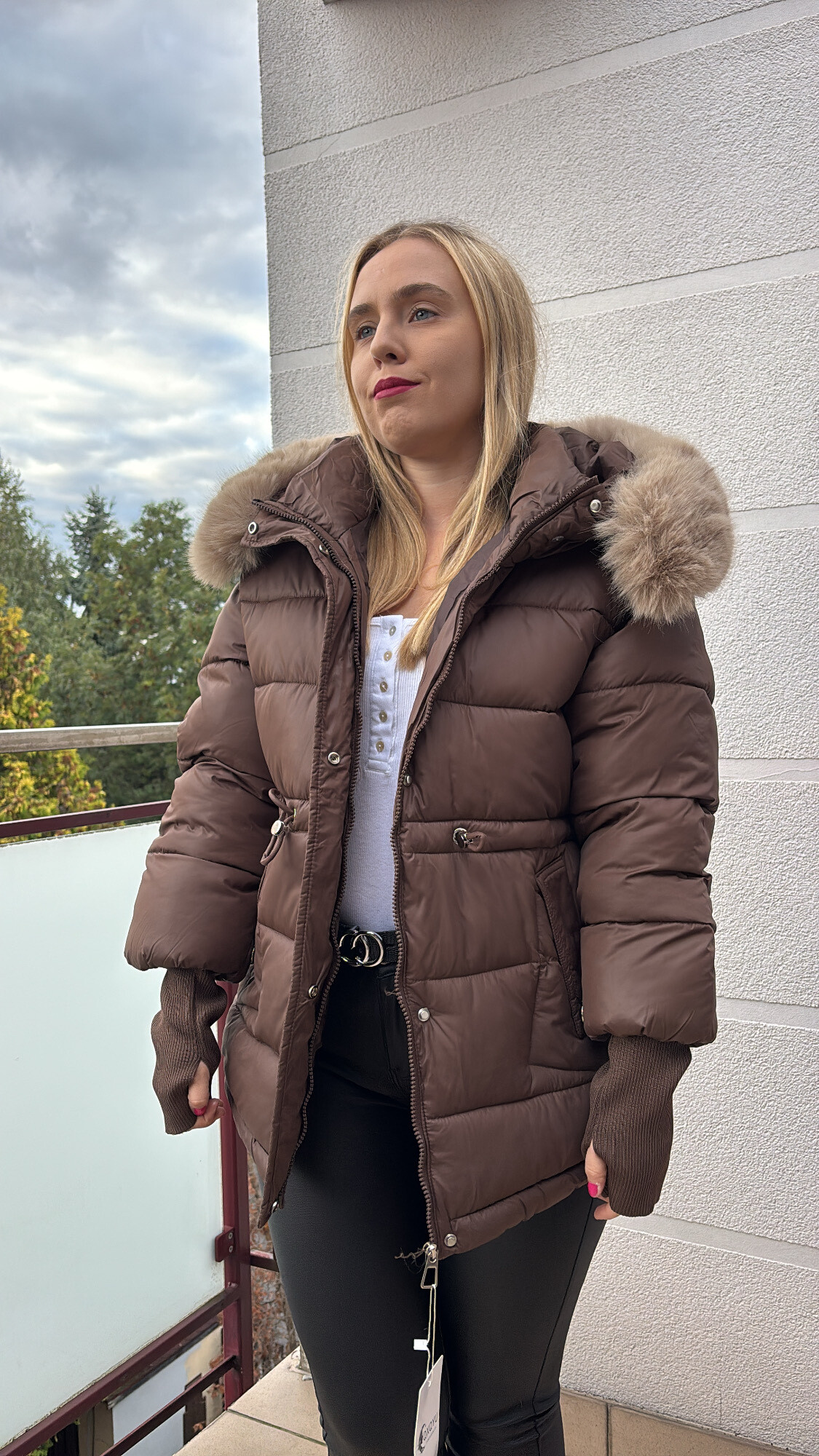Krótka, puchowa kurtka z ściągaczami po bokach świetne dopełnienie stylizacji jesienno-zimowych.