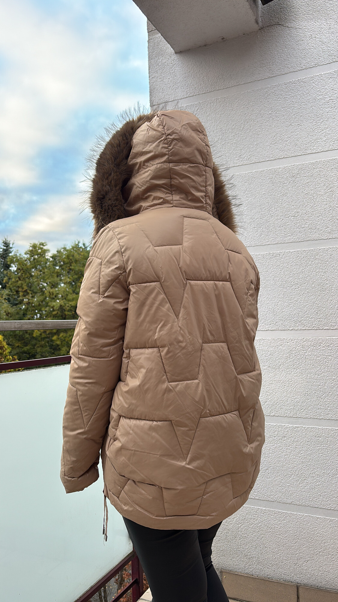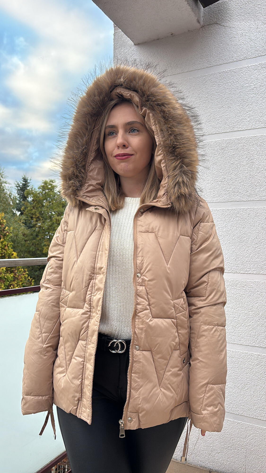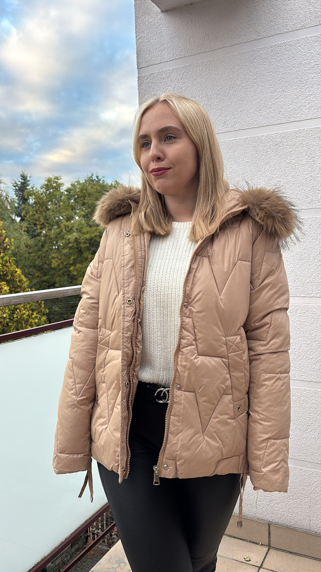 Stylowa i ciepła kurtka na chłodniejsze dni. Charakterystyczny pikowany wzór w kształcie litery V nadaje jej nowoczesnego wyglądu i optycznie wysmukla sylwetkę. Miękki futrzany kołnierz dodaje elegancji, a praktyczne kieszenie i zapięcie na suwak zapewniają wygodę. Kurtka posiada ściągacze po bokach, dzięki którym można dopasować ją idealnie do sylwetki. Doskonały wybór do miejskich i casualowych stylizacji.
