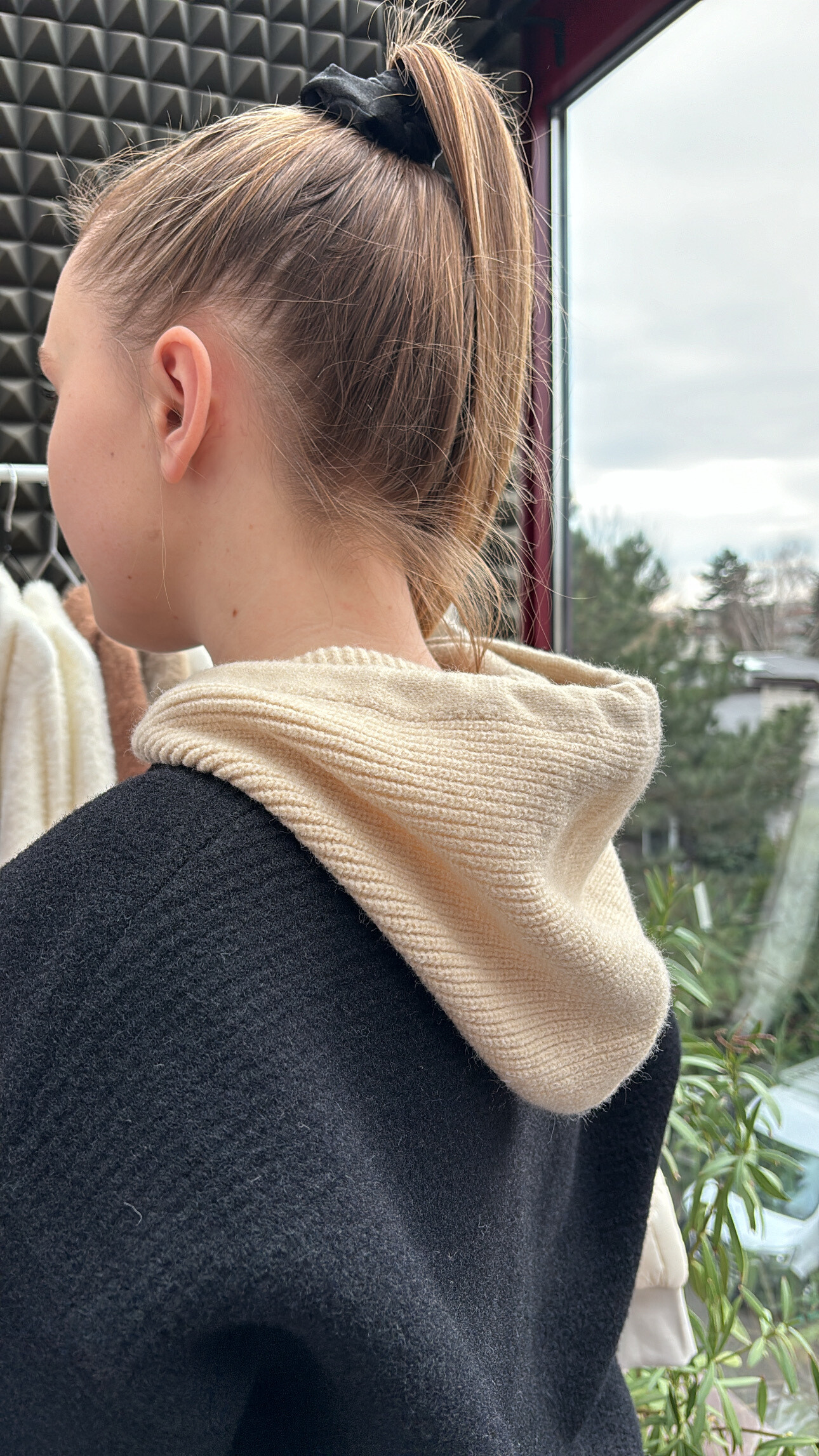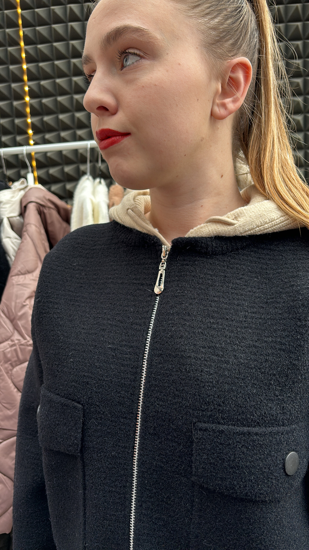 Elegancki sweterek z funkcją odpinanego kaptura w kolorze czarnym. Dwie kieszenie z przodu. Zapinany na srebrny suwak. Dostępny w 3 wariantach kolorystycznych: biały, czarny oraz bordowy.