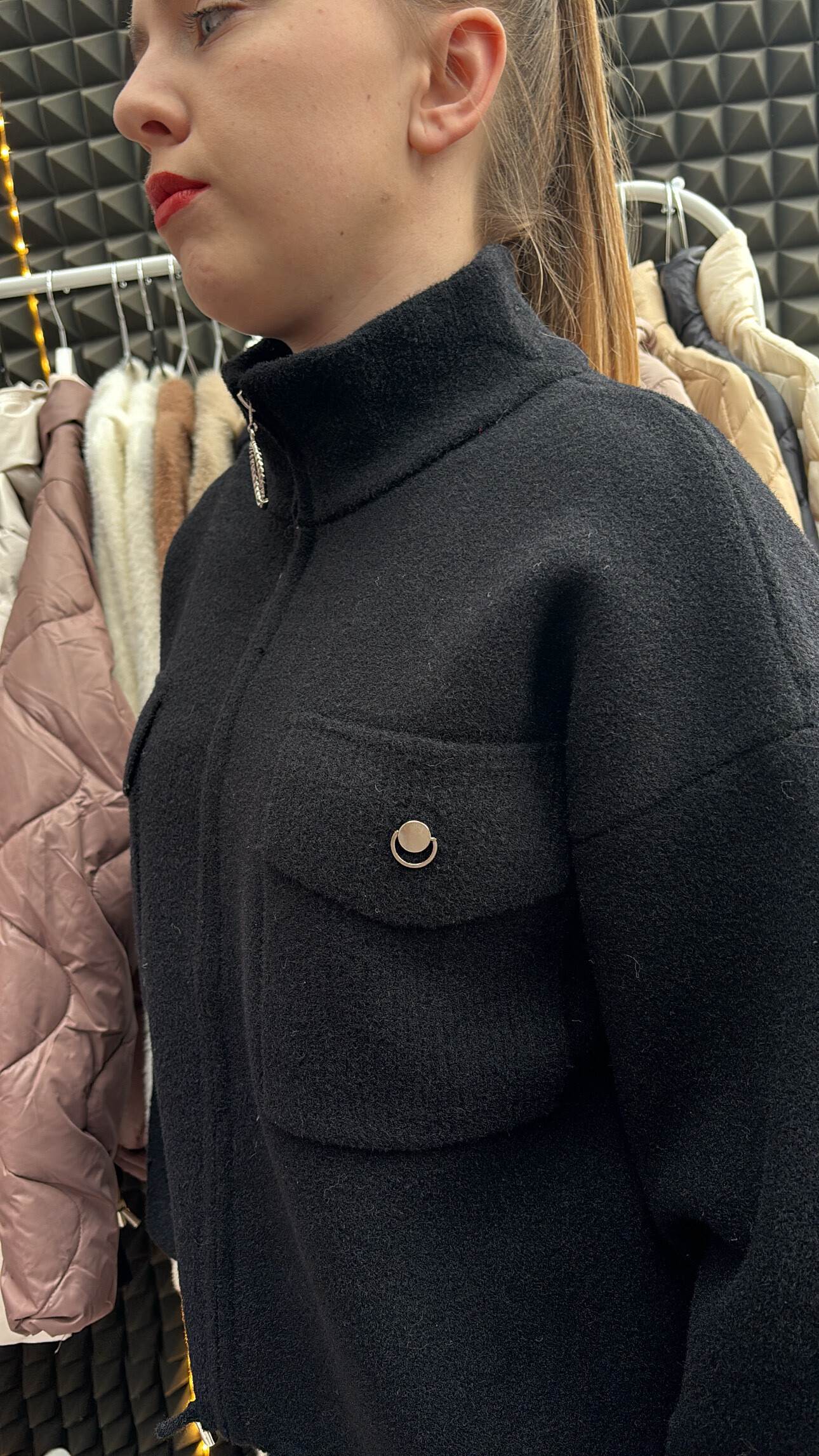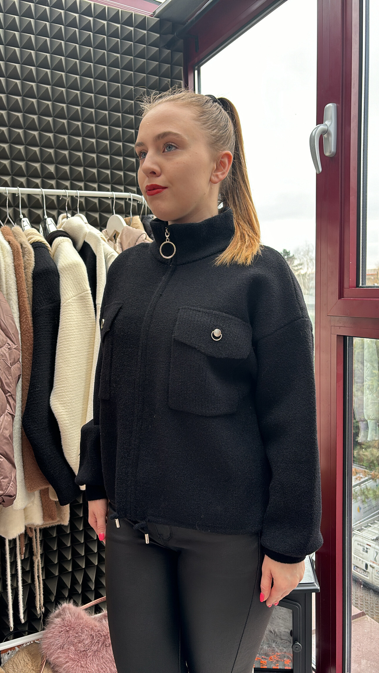 Elegancki sweterek na stójce. Dwie kieszenie z przodu. Zapinany na srebrny suwak z ozdobnym kołem. Posiada ściągacz na dole. Materiał bardzo miły w dotyku.