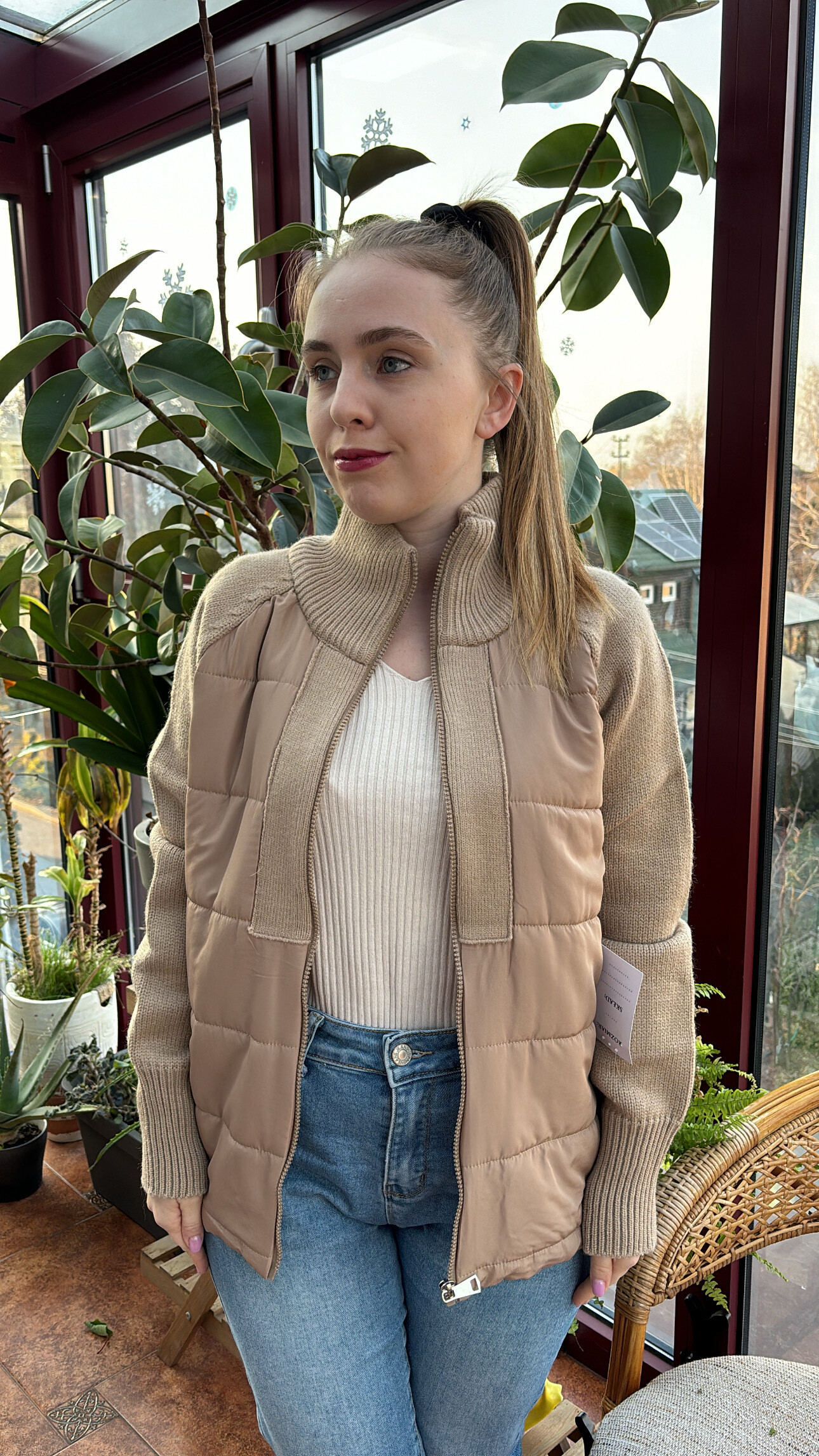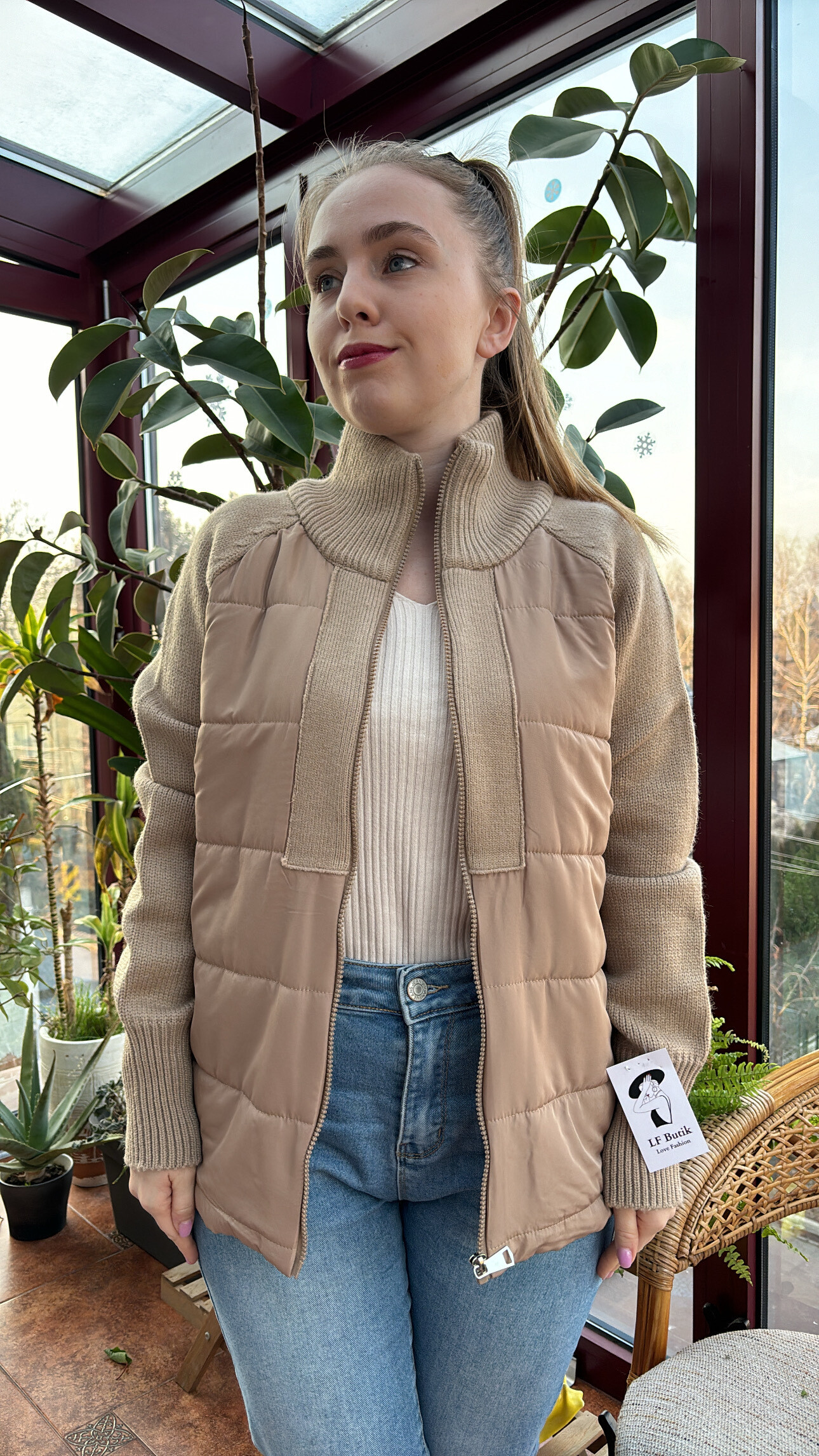Ten wyjątkowy sweterek łączy klasyczny komfort z nowoczesnym designem. Sweterkowe rękawy zapewniają miękkość i wygodę, podczas gdy pikowany materiał w pozostałej części nadaje całości elegancki, strukturalny wygląd.